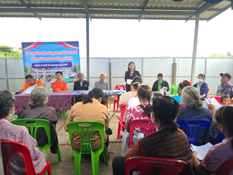วันที่ 25 กันยายน 2568 นางสาวขนิษฐา ทูลธรรม ผู้อำนวยการกลุ่มส่งเสริมสหกรณ์ 4 พร้อมด้วยบุคลากรกลุ่มส่งเสริมสหกรณ์ 4 สำนักงานสหกรณ์จังหวัดยโสธร เข้าร่วมประชุมใหญ่สามัญประจำปีสำหรับปีบัญชีสิ้นสุดวันที่ 30 เมษายน 2568 ณ สหกรณ์ยางพารายโสธร จำกัด ตำบลส้มผ่อ อำเภอไทยเจริญ จังหวัดยโสธร สหกรณ์ยางพารายโสธร จำกัด ณ วันสิ้นปีมีทุนดำเนินงานทั้งสิ้น จำนวน 12,683,775.22 บาท มีสมาชิก ณ วันสิ้นปี จำนวน 338 คน มีสมาชิกเข้าร่วมประชุมใหญ่ จำนวน 150 คน สหกรณ์ดำเนินธุรกิจเพียงด้านเดียว คือธุรกิจรวบรวมผลิตผล มีมูลค่าธุรกิจ จำนวน 8,107,486.00 บาท การประชุมใหญ่ครั้งนี้สหกรณ์มีมติไม่ขัดต่อกฎหมาย ข้อบังคับและระเบียบของสหกรณ์