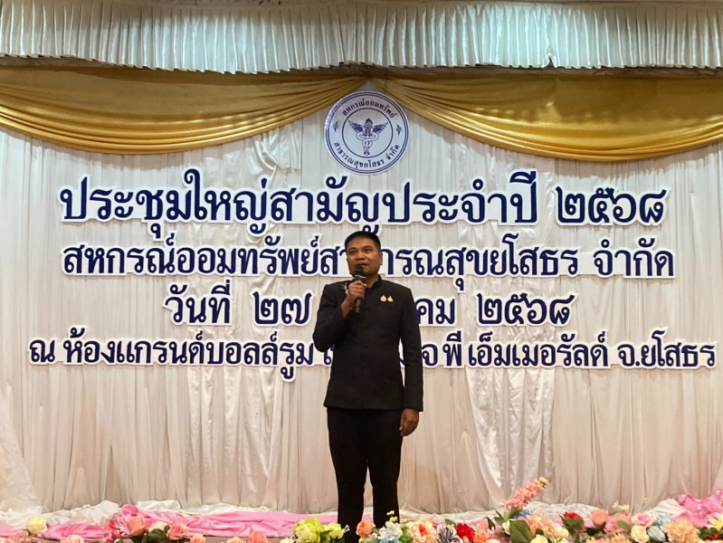 นางสาววชิรญาณ์ พิมพร ผู้อำนวยการกลุ่มส่งเสริมและพัฒนาธุรกิจสหกรณ์ นางสาวจิราภรณ์ วงศ์พาณิชย์ ผู้อำนวยการกลุ่มตรวจการสหกรณ์ พร้อมด้วยบุคลากรสำนักงานสหกรณ์จังหวัดยโสธร เข้า ร่วมประชุมใหญ่สามัญประจำปี 2568 สหกรณ์ออมทรัพย์สาธารณสุขยโสธร จำกัด ปีบัญชีสิ้นสุด 30 พฤศจิกายน 2568 ซึ่งผลการดำเนินงานมีกำไร 172,879,483.17 บาท มีผลการ ประเมินชั้นคุณภาพการควบคุมภายในระดับดีมาก โดยมีนายภาณุพงศ์ เเสงคำ สหกรณ์จังหวัดยโสธร ร่วมเป็นเกียรติในพิธีเปิดการประชุม และแสดงความยินดีกับผลการดำเนินงานที่ผ่านมาของสหกรณ์ ตลอดจนมอบเกียรติบัตรสหกรณ์ที่มีผลการจัดชั้นความเข้มแข็งระดับ 1 ซึ่งแสดงถึงความร่วมมือร่วมใจของคณะกรรมการดำเนินการฝ่ายจัดการสหกรณ์และสมาชิกที่มุ่งพัฒนางานตามหลักธรรมาภิบาล มีการบริหารจัดการอย่างมีประสิทธิภาพ ควบคุมความเสี่ยงอย่างรอบด้าน ณ ห้อง แกรนด์บอลรูม โรงแรม เจ.พี.เอ็มเมอรัลด์ จังหวัดยโสธร