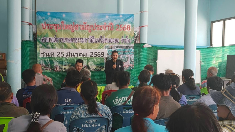 นางพัชรินทร์ ทิวะศะศิธร์ ผู้อำนวยการกลุ่มส่งเสริมสหกรณ์ 3 พร้อมด้วยบุคลากรกลุ่มส่งเสริมสหกรณ์ 3 เข้าร่วมประชุมใหญ่สามัญประจำปี สหกรณ์การเกษตรธรรมชาติอินทรีย์หนองยอ จำกัด ตำบลกำแมด อำเภอกุดชุม จังหวัดยโสธร ปีบัญชีสิ้นสุดวันที่ 31 ตุลาคม 2568 ได้แนะนำให้สหกรณ์ ฯ เสริมระบบองค์กร พัฒนาธุรกิจอินทรีย์ สร้างมูลค่าเพิ่ม เสริมระบบสู่ต้นแบบอินทรีย์ ส่งเสริมการออม โดยสะสมทุนเพิ่มขึ้น และหาแนวทางบริหารจัดการในการดำเนินธุรกิจให้เกิดผลตอบแทนสูงสุด ณ สหกรณ์การเกษตรธรรมชาติอินทรีย์หนองยอ จำกัด ตำบลกำแมด อำเภอกุดชุม จังหวัดยโสธร